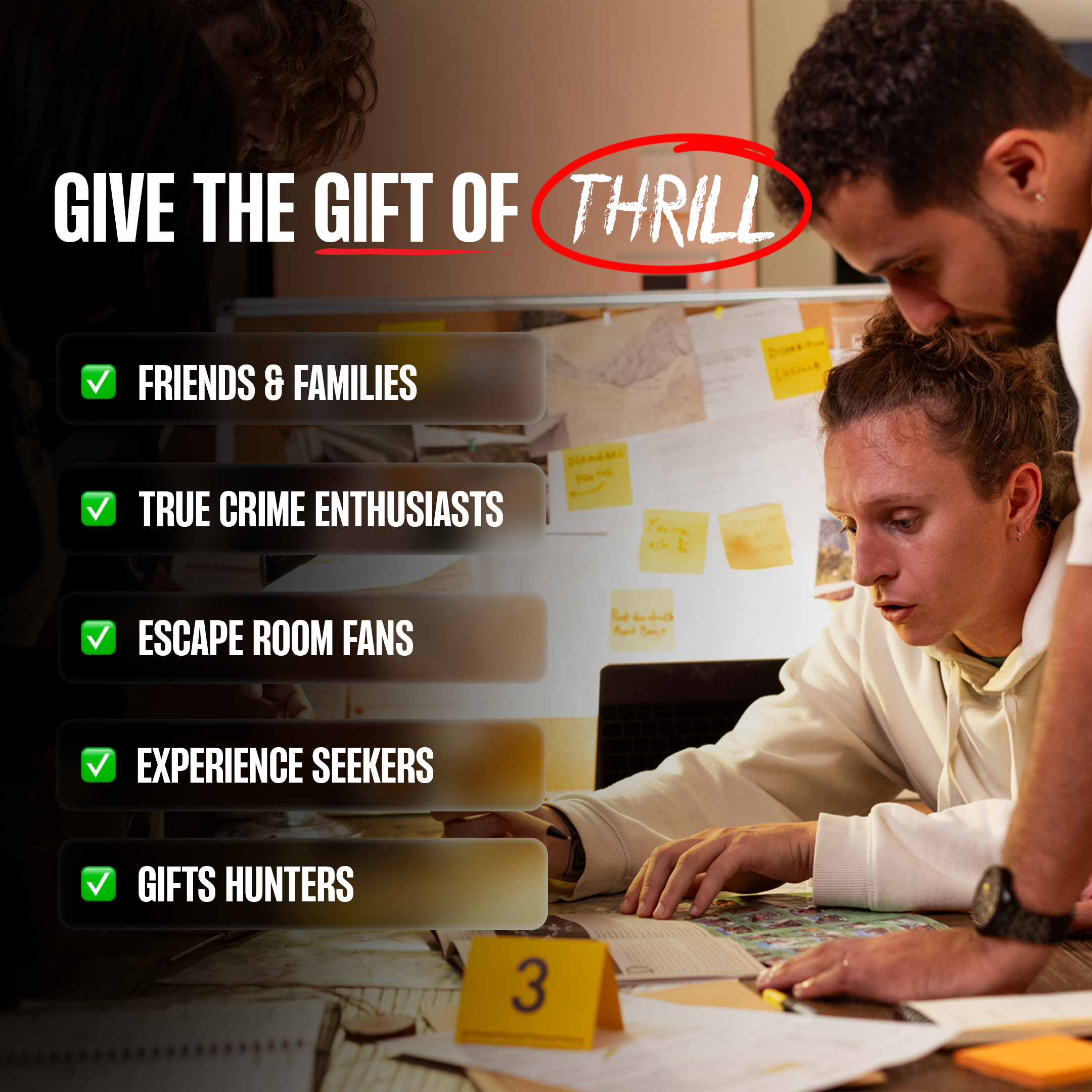 The price therefore pays for the production of all the physical, digital and audiovisual content for each of our investigation games. This includes: